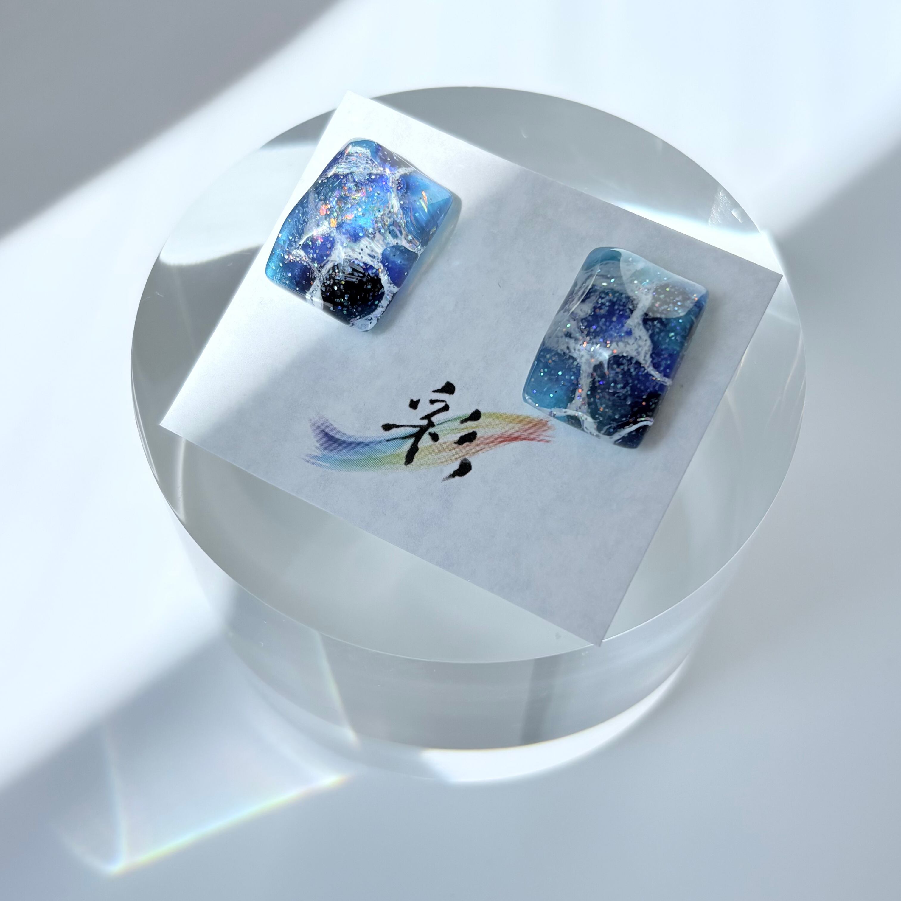 書道半紙にデザインをして、キラキラのラメなどと一緒にレジン液で閉じ込めています。