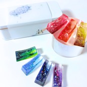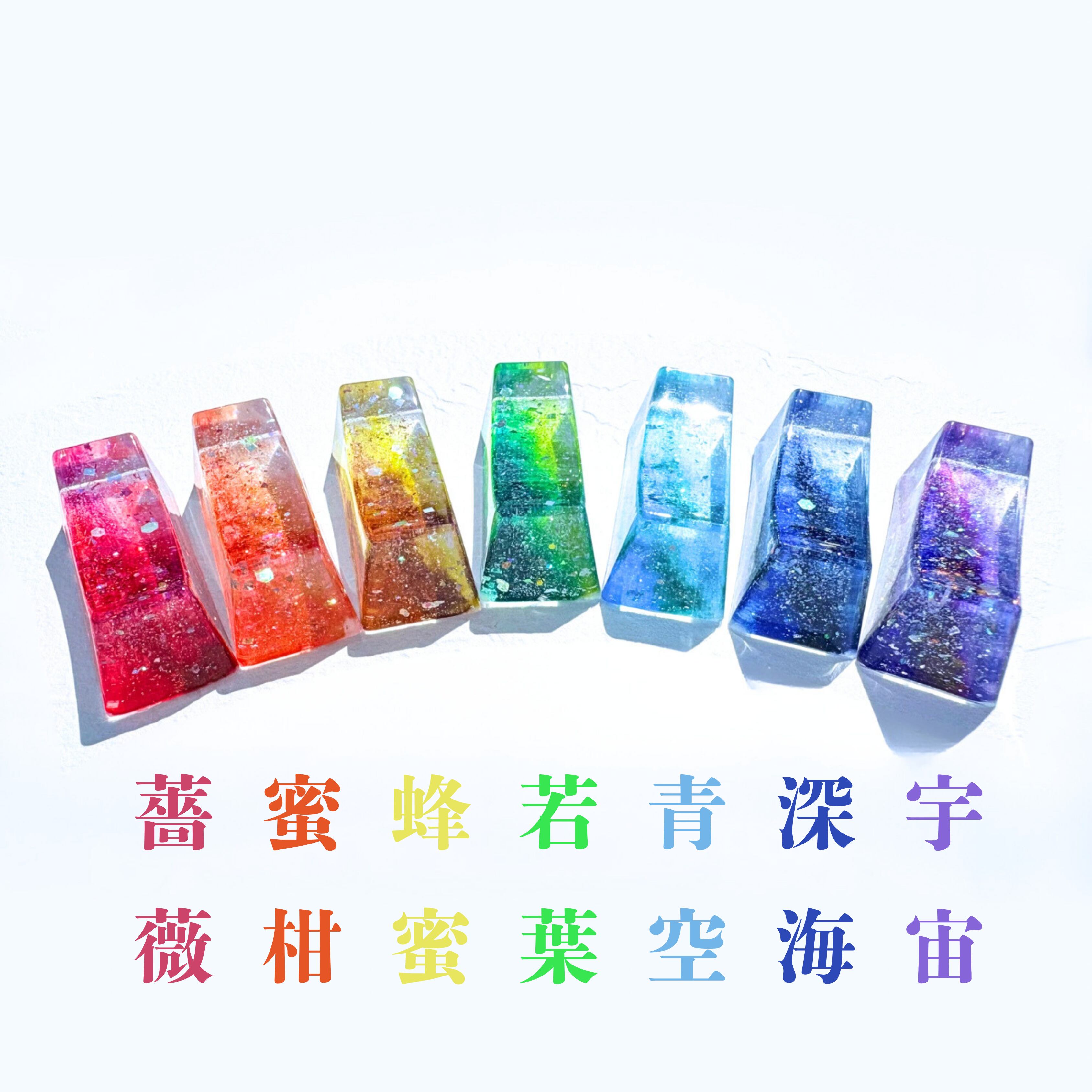 書道半紙に筆でデザインをして、キラキラのラメなどと一緒にレジン液で閉じ込めています。