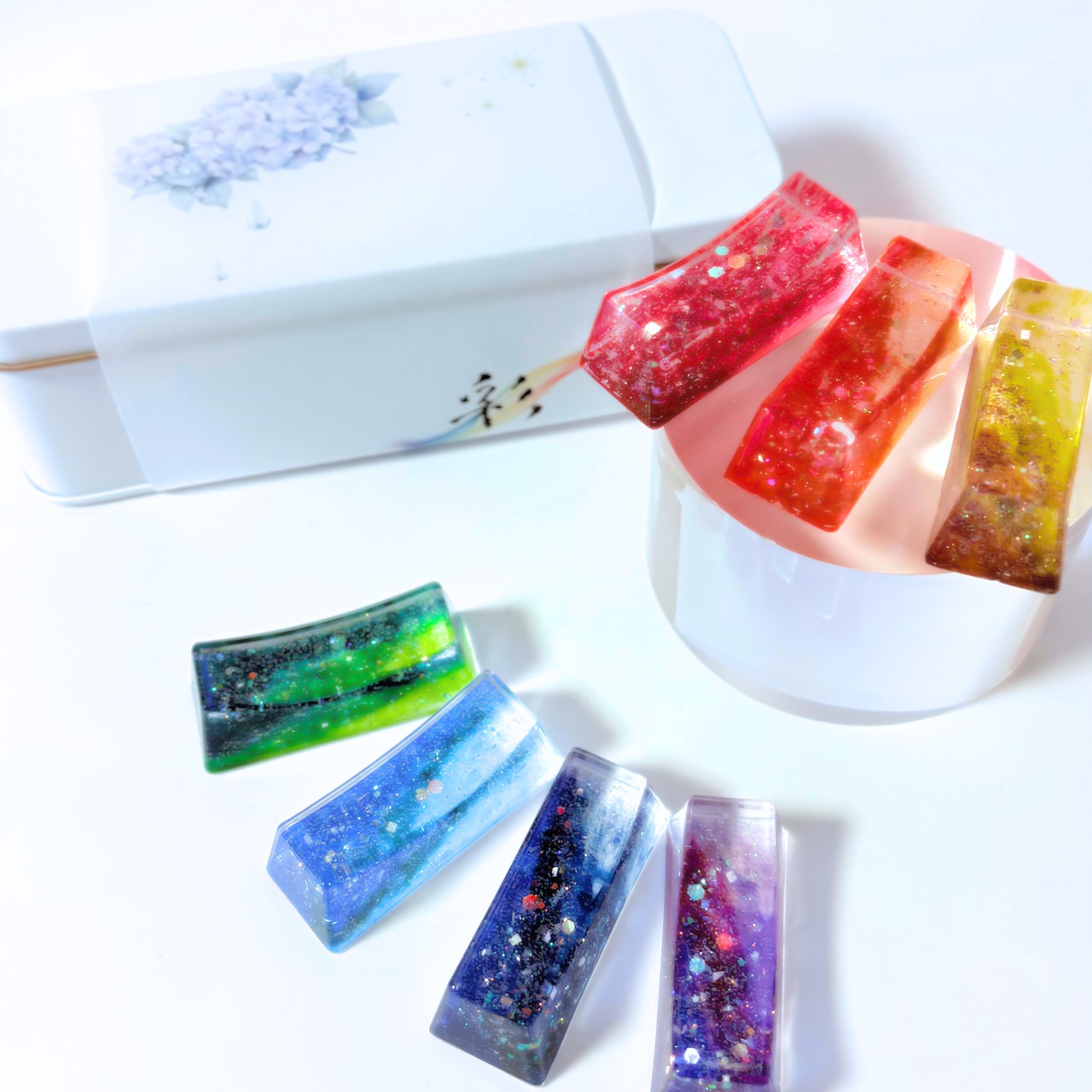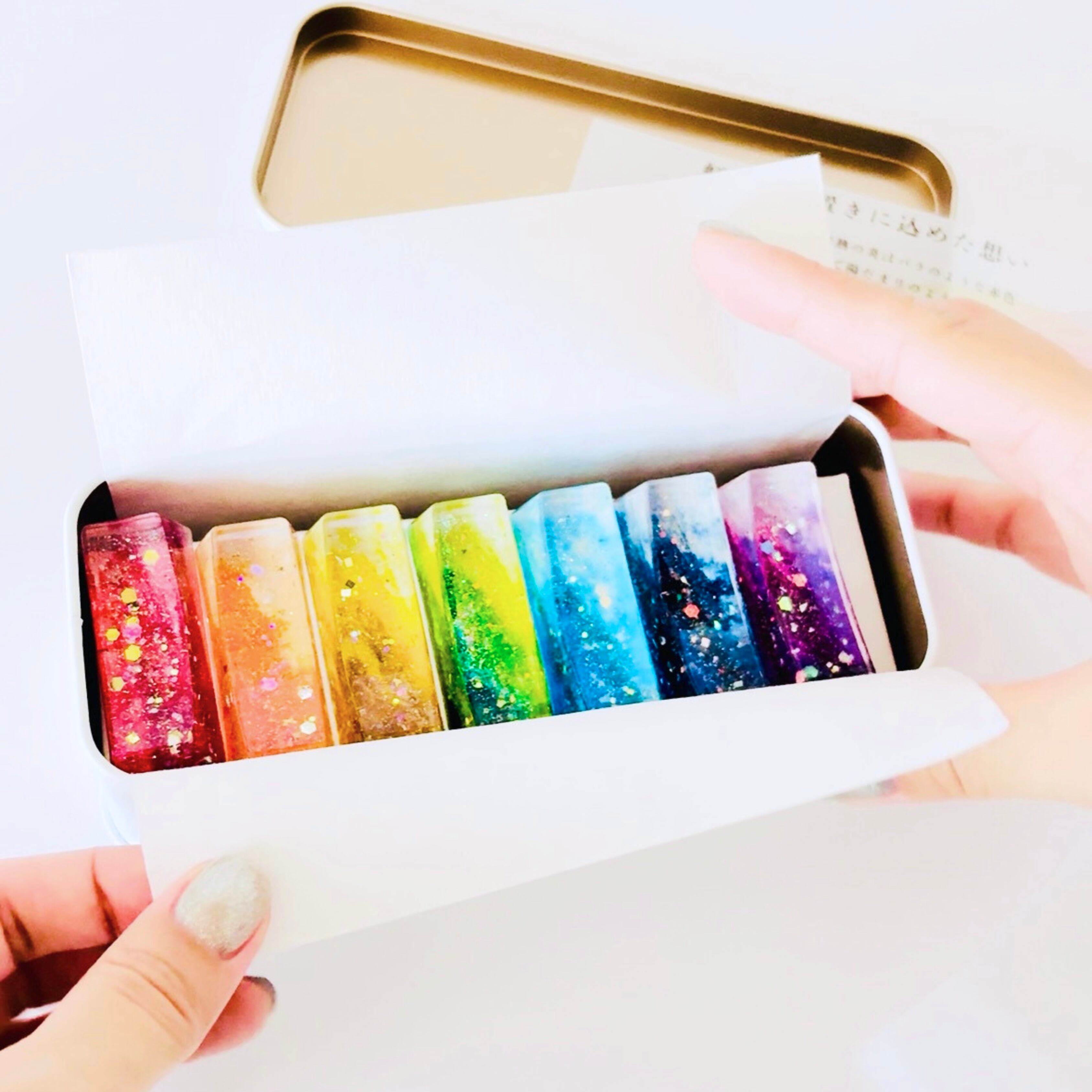 虹色の7色をセットにして、お菓子のような可愛いカンカンに入れました。