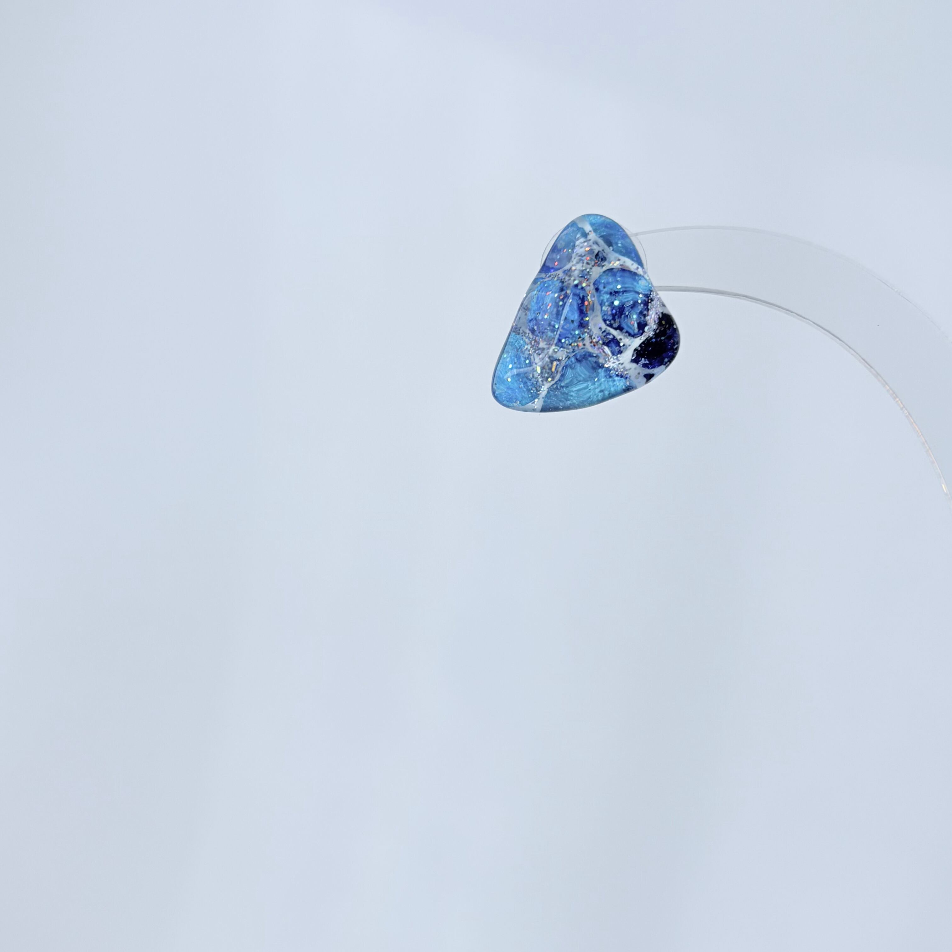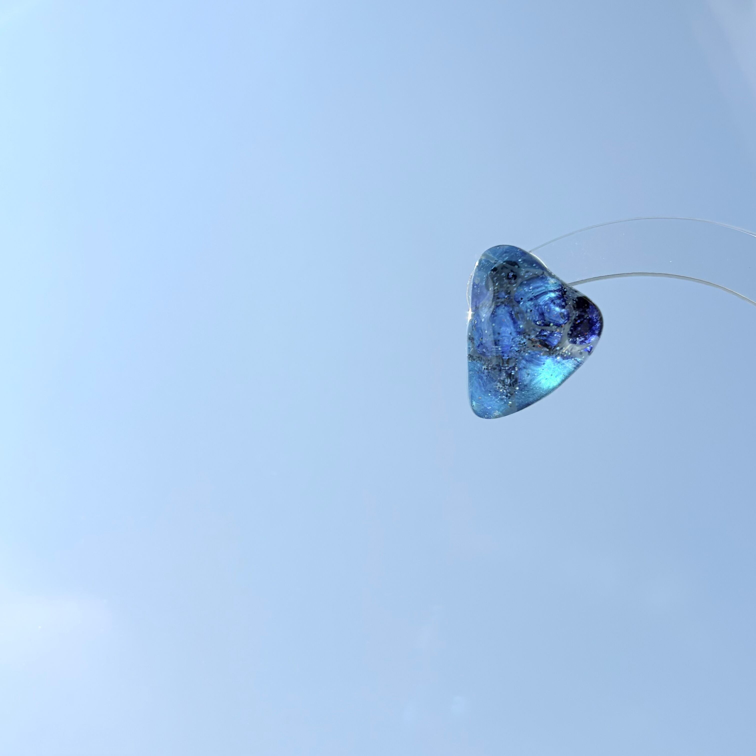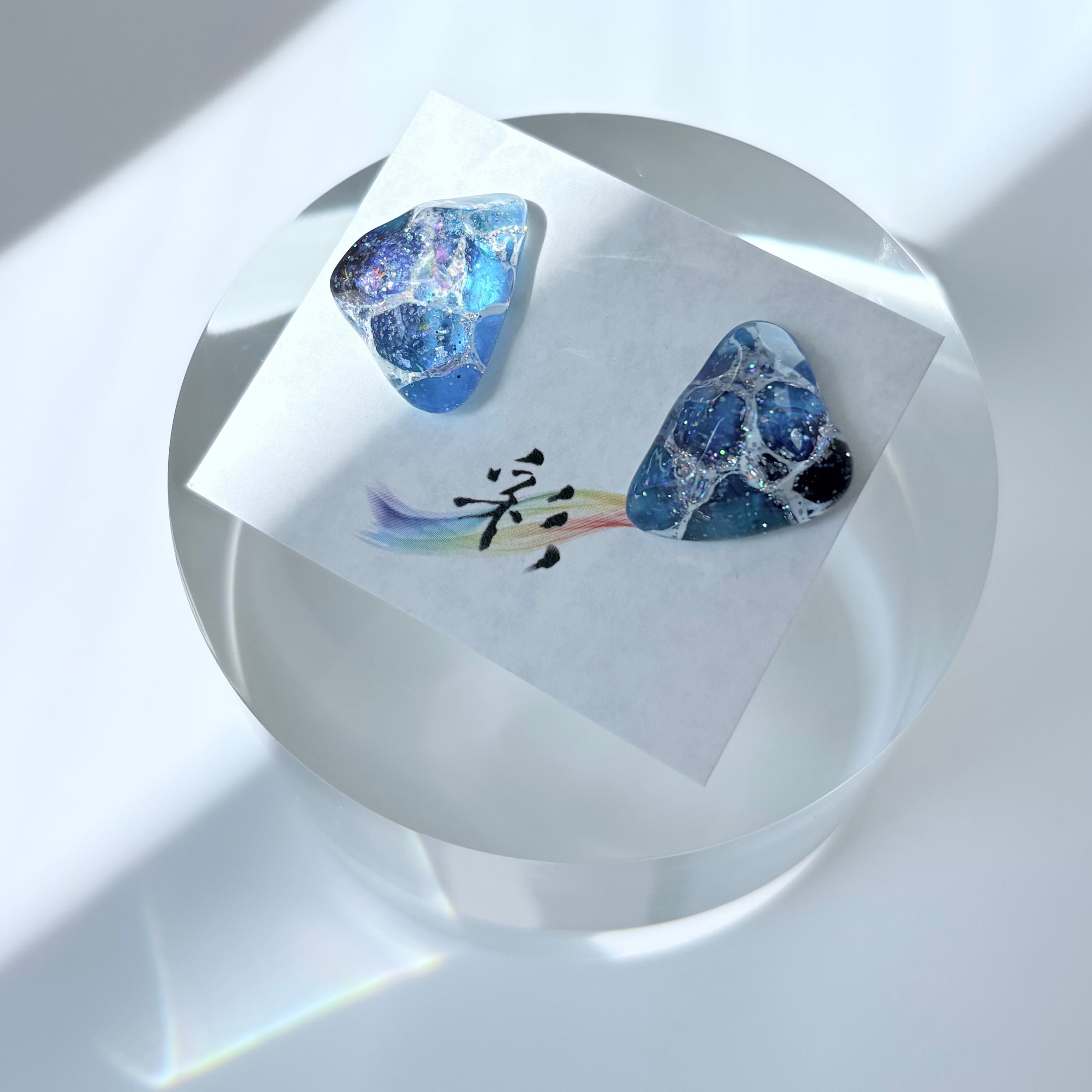 書道半紙にデザインをして、キラキラのラメなどと一緒にレジン液で閉じ込めています。