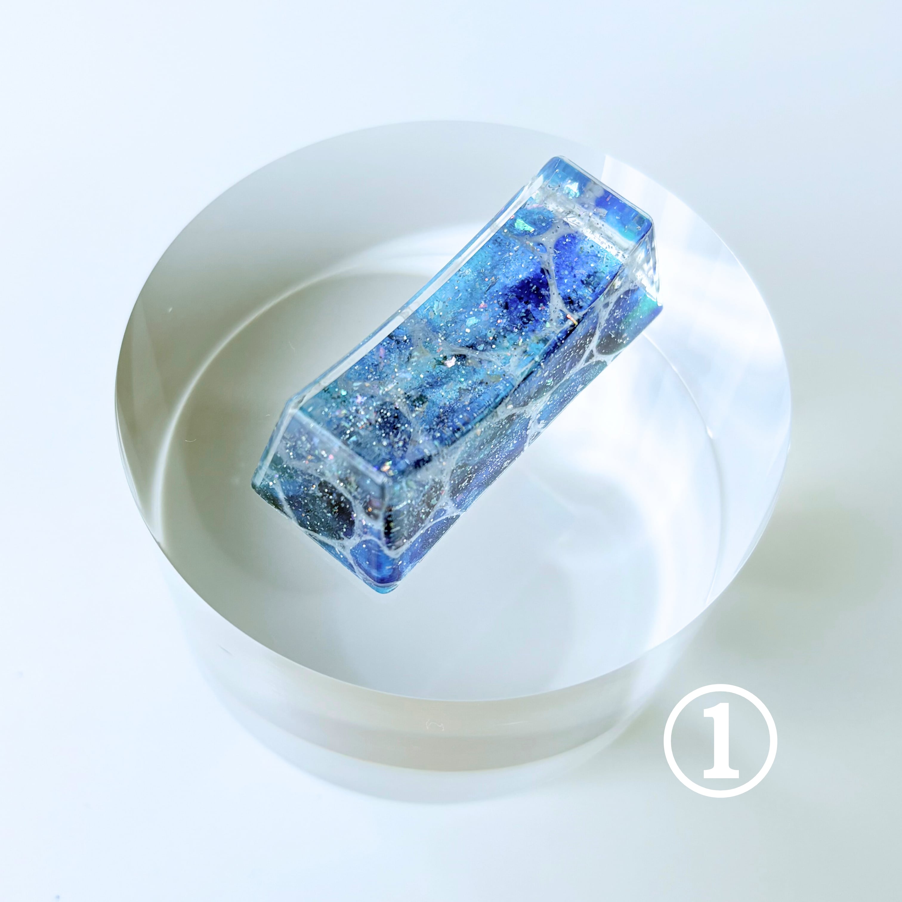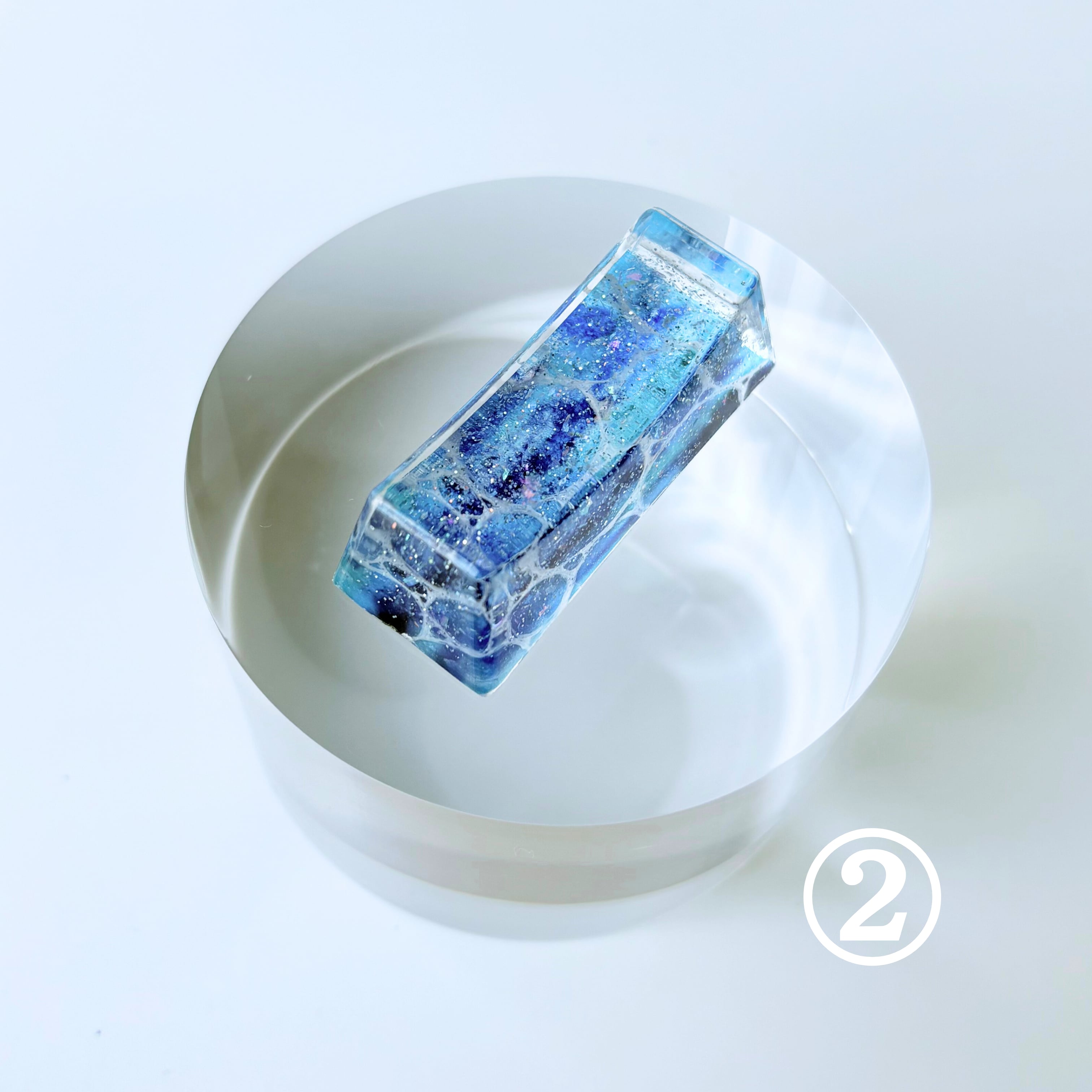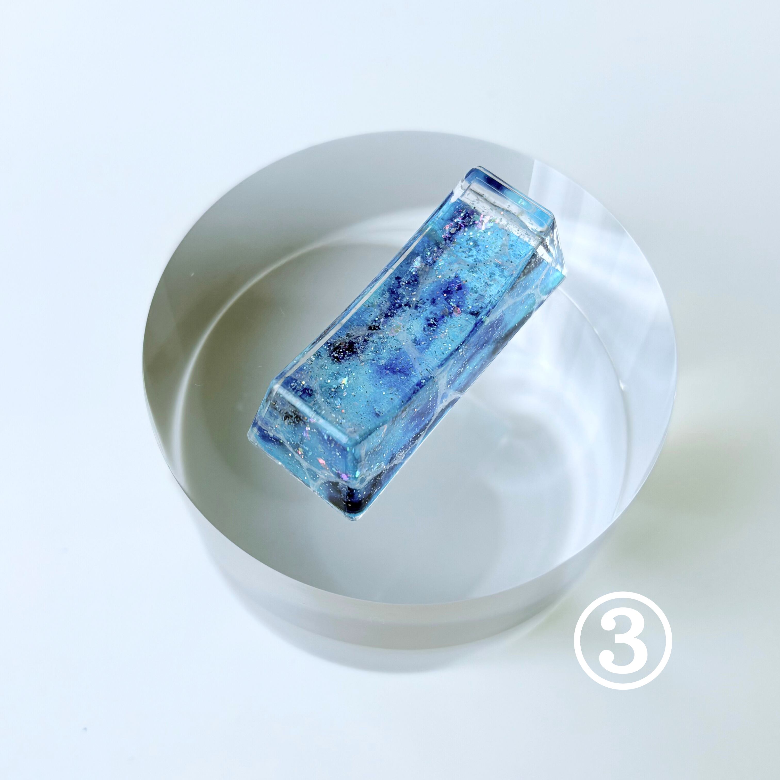 書道半紙にデザインをして、キラキラのラメなどと一緒にレジン液で閉じ込めています。