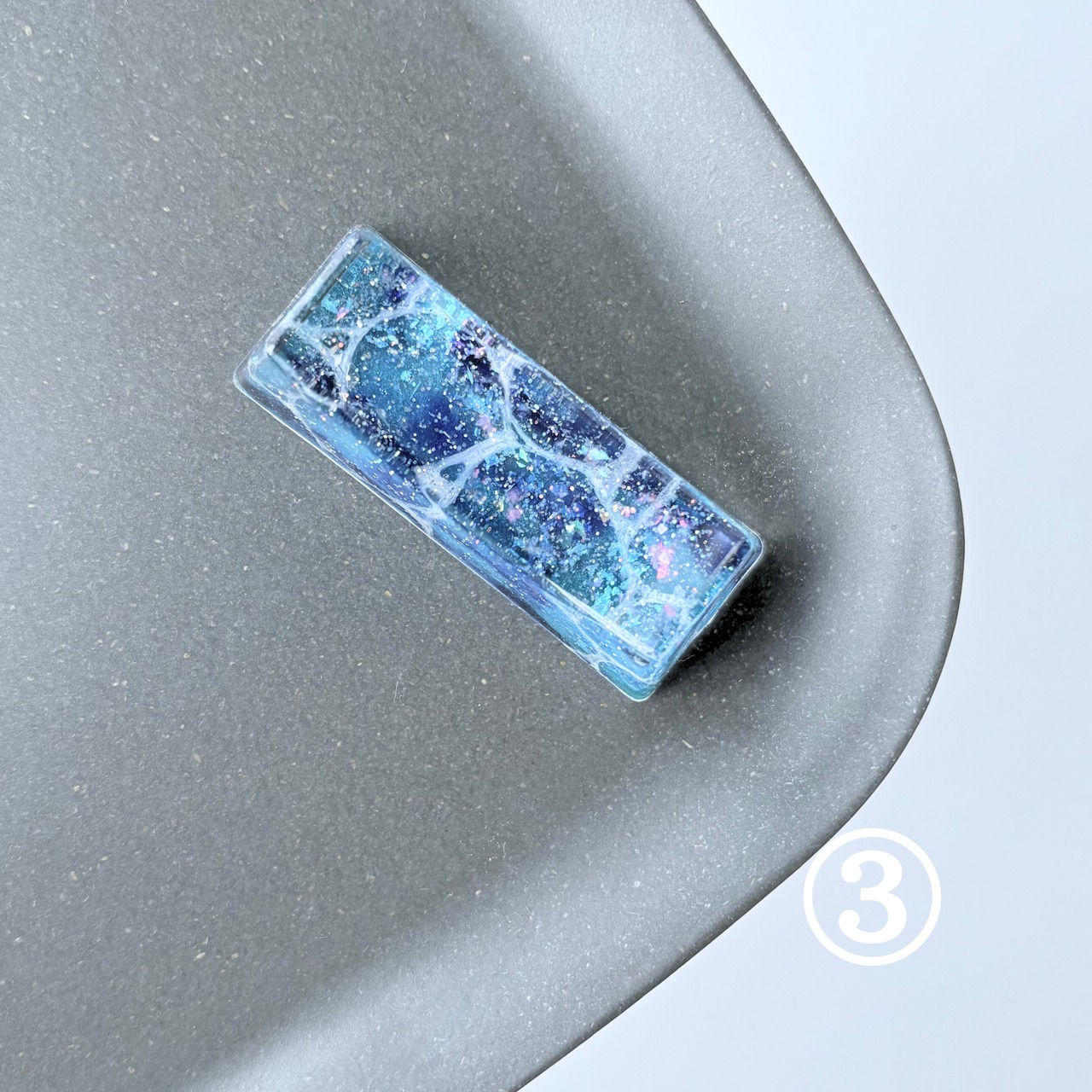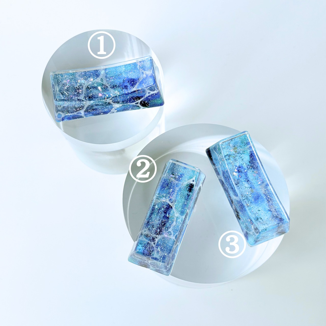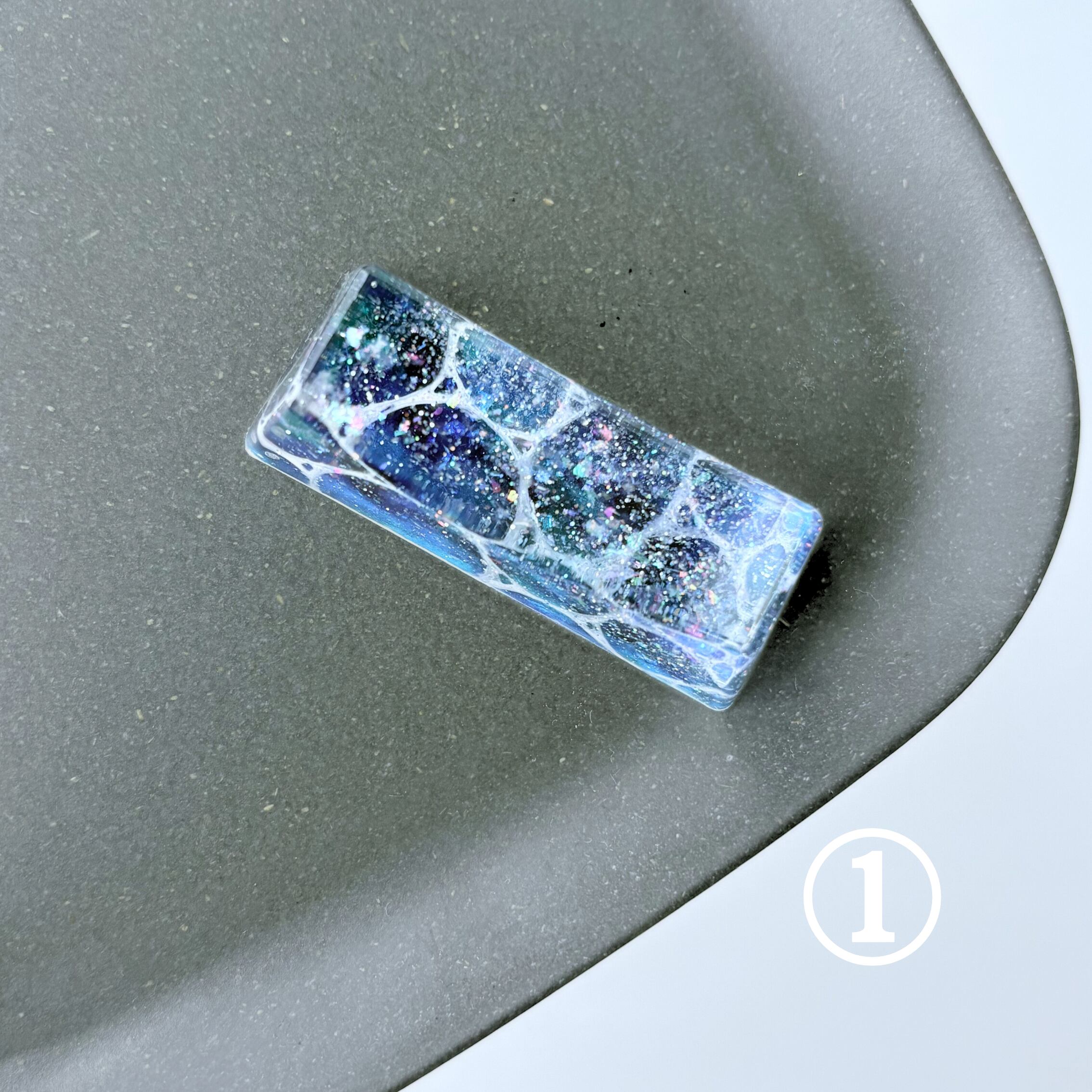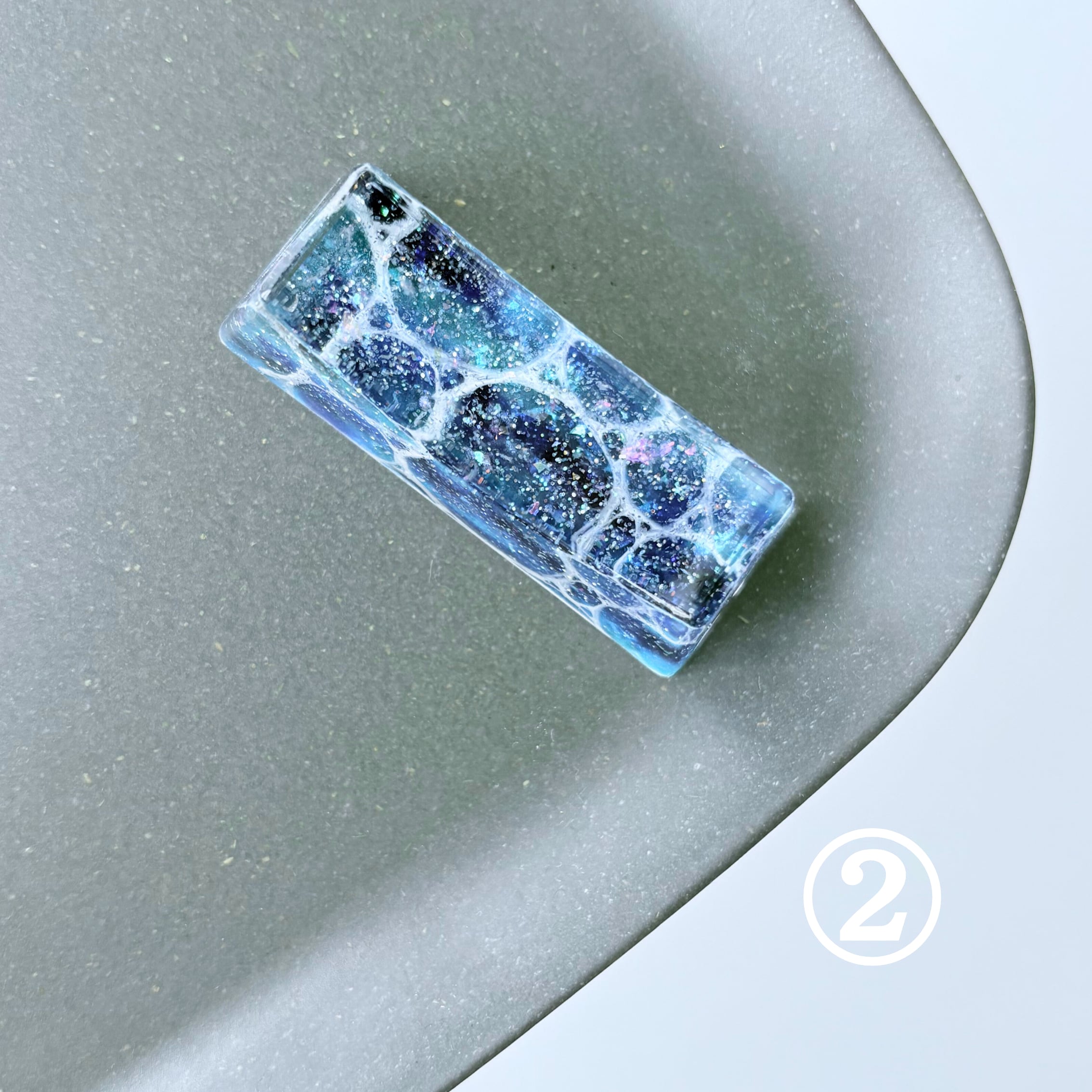 書道半紙にデザインをして、キラキラのラメなどと一緒にレジン液で閉じ込めています。