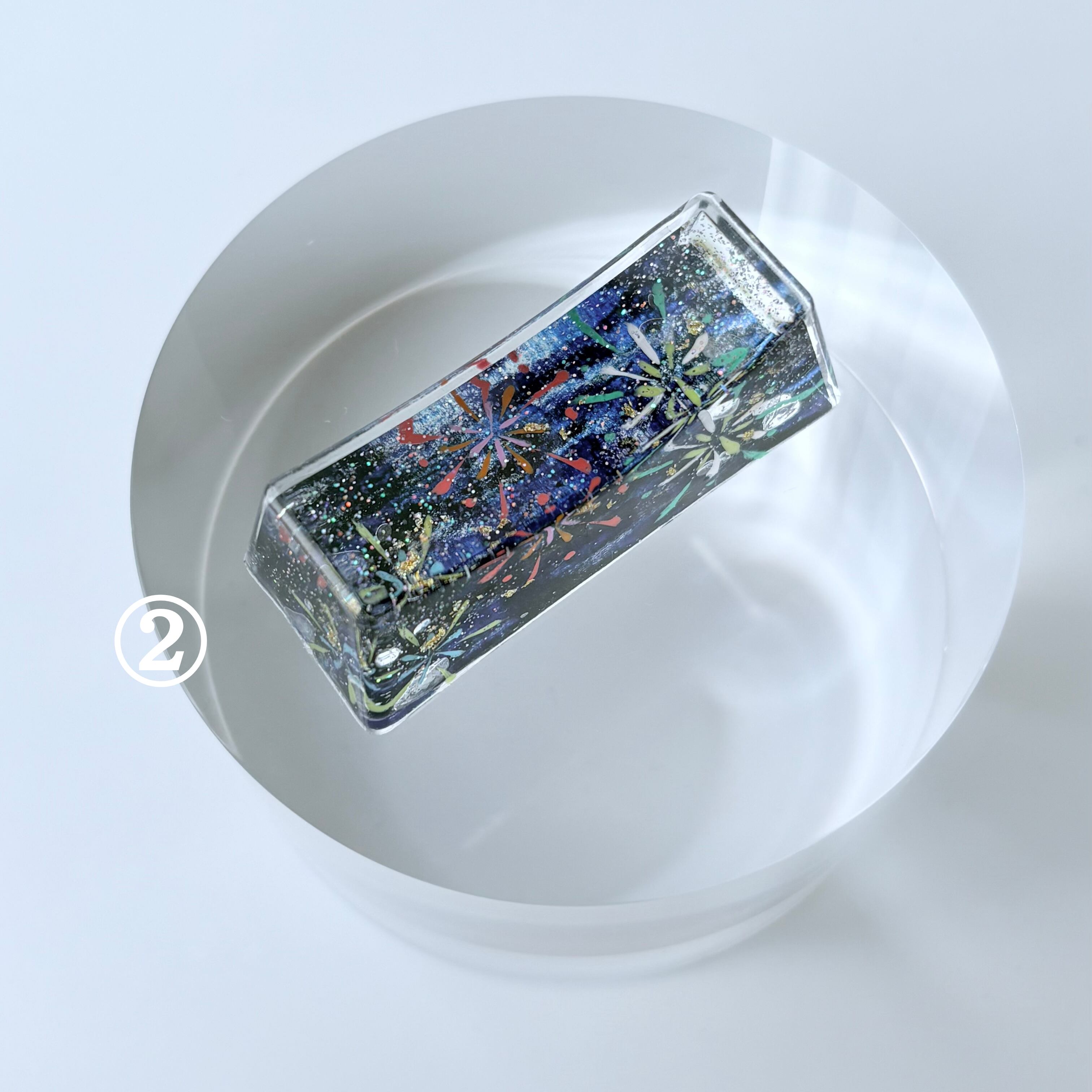 書道半紙にデザインをして、キラキラのラメなどと一緒にレジン液で閉じ込めています。