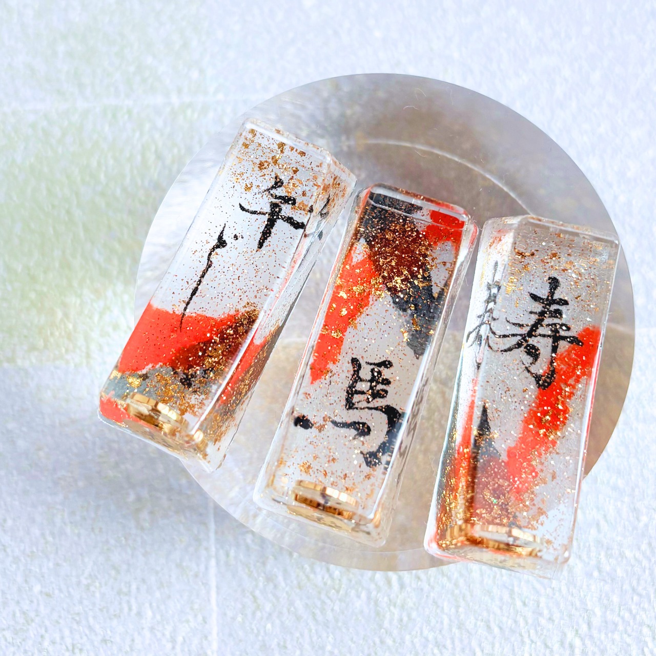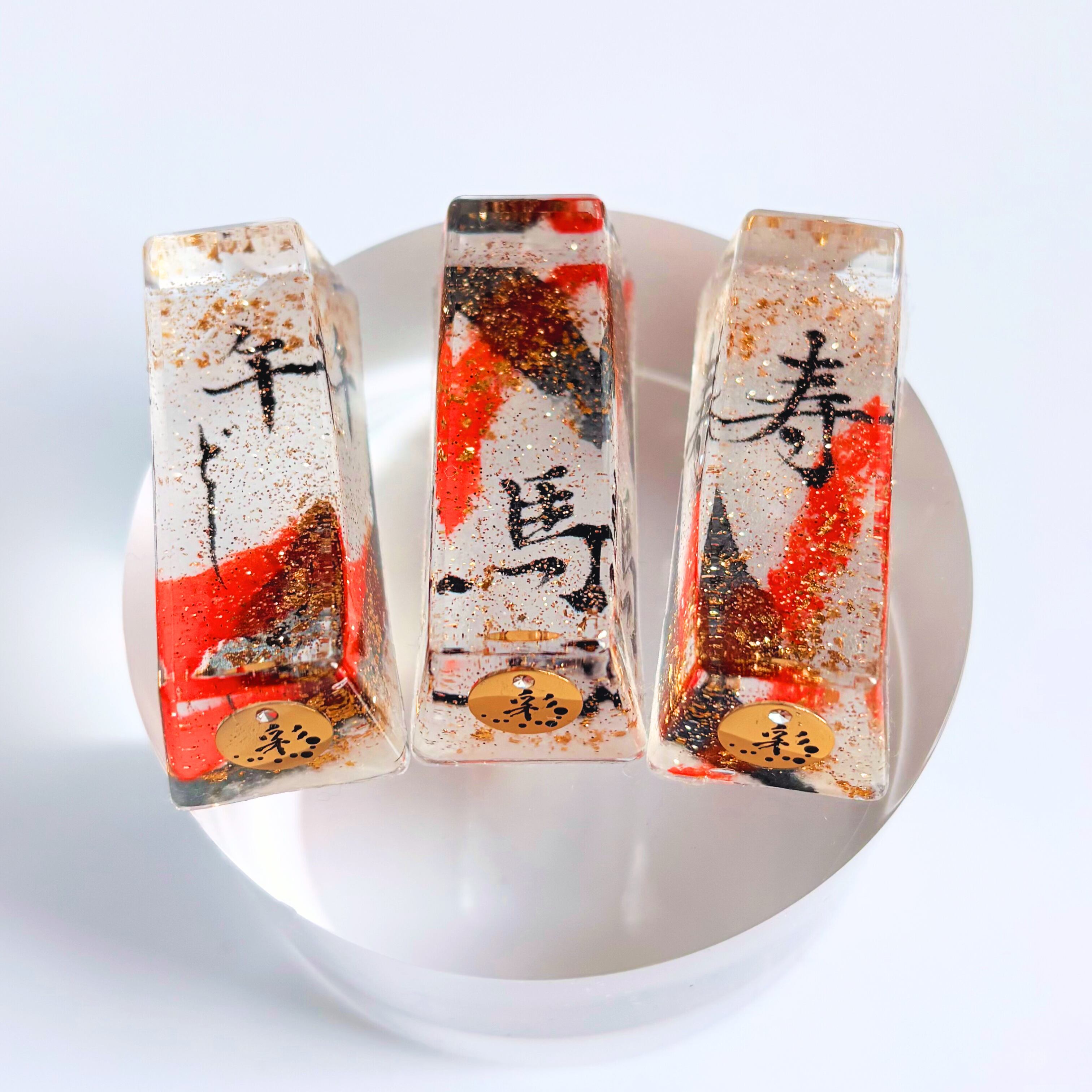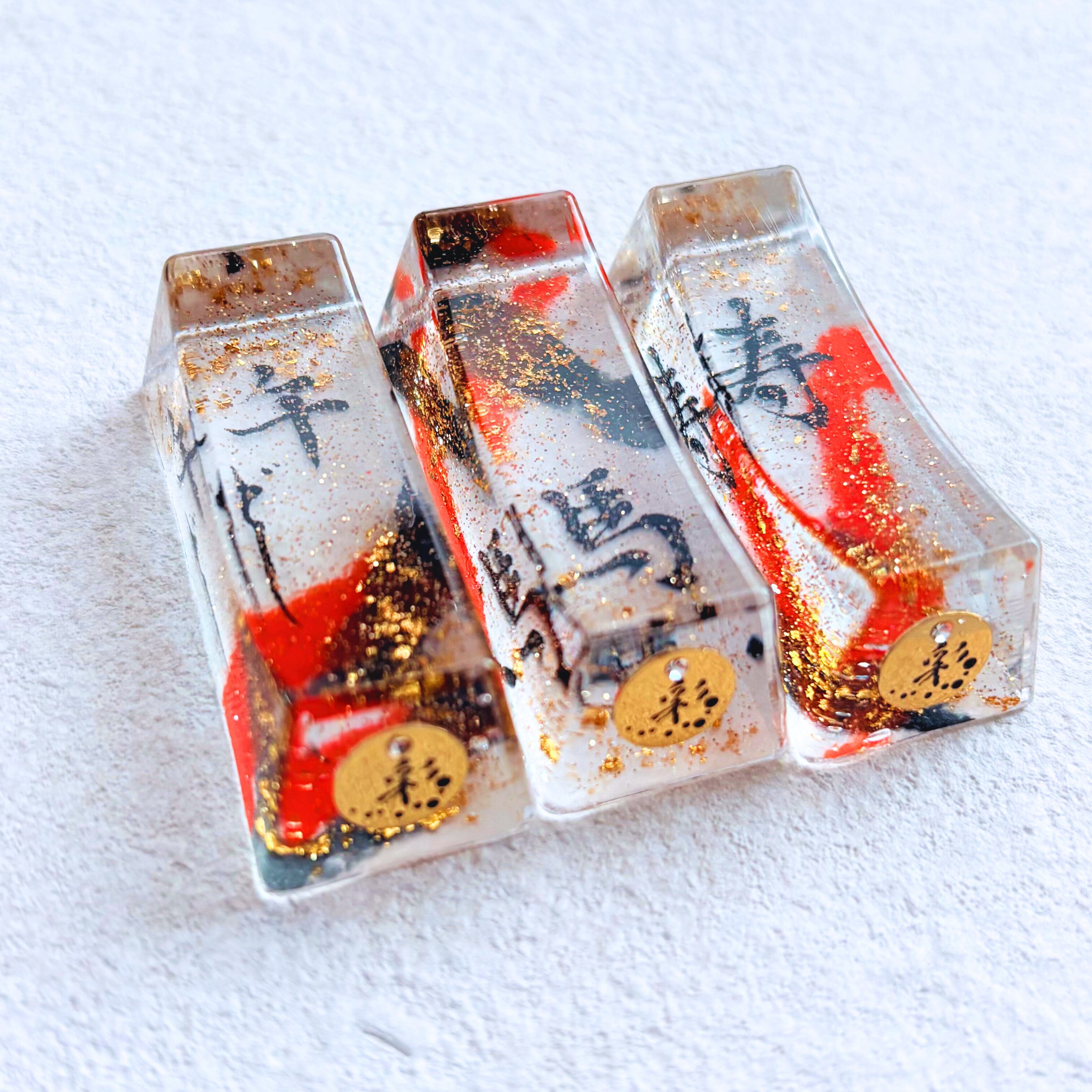 書道半紙に筆でデザインをして、キラキラのラメ・金箔などと一緒にレジン液で閉じ込めています。